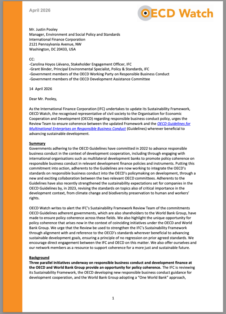 OECD Watch has sent a joint letter to the International Finance Corporation (IFC) calling for its Sustainability Framework Review to align with the OECD Guidelines for Multinational Enterprises on Responsible Business Conduct – raising the bar on climate, human rights & due diligence.